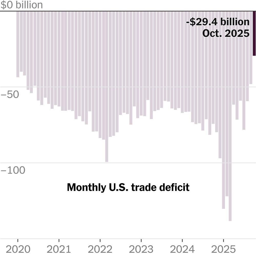The monthly trade deficit continued to shrink in October after President Trump imposed sweeping tariffs on imports, the latest data showed. Read more