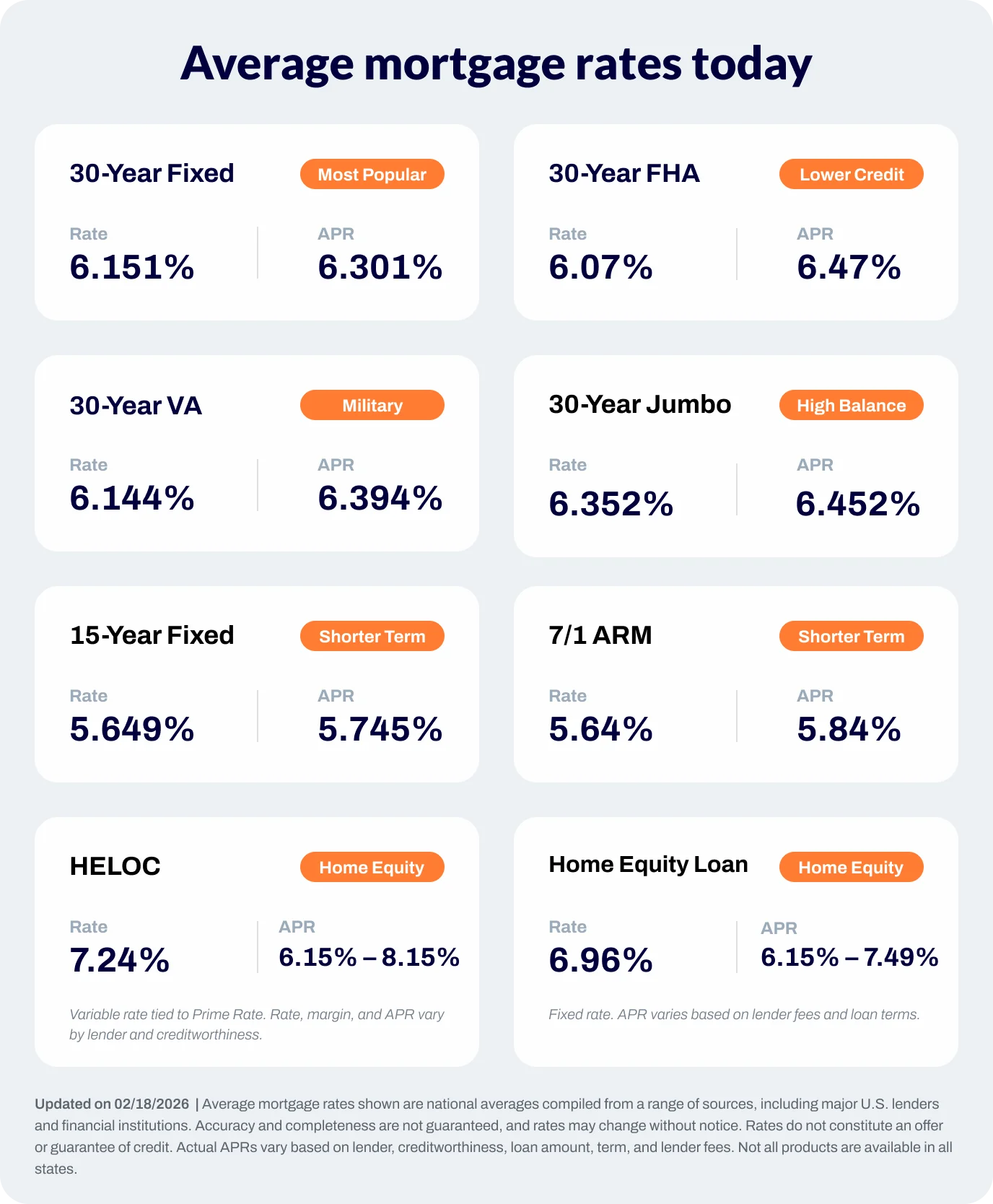- According to Freddie Mac’s weekly national rate survey, the rate on a 30-year fixed-rate mortgage averaged 6.09% for the week ending February 12, down by 0.02 percentage points. The rate on a 15-year fixed-rate loan decreased by 0.06 percentage points to an average of 5.44%.
