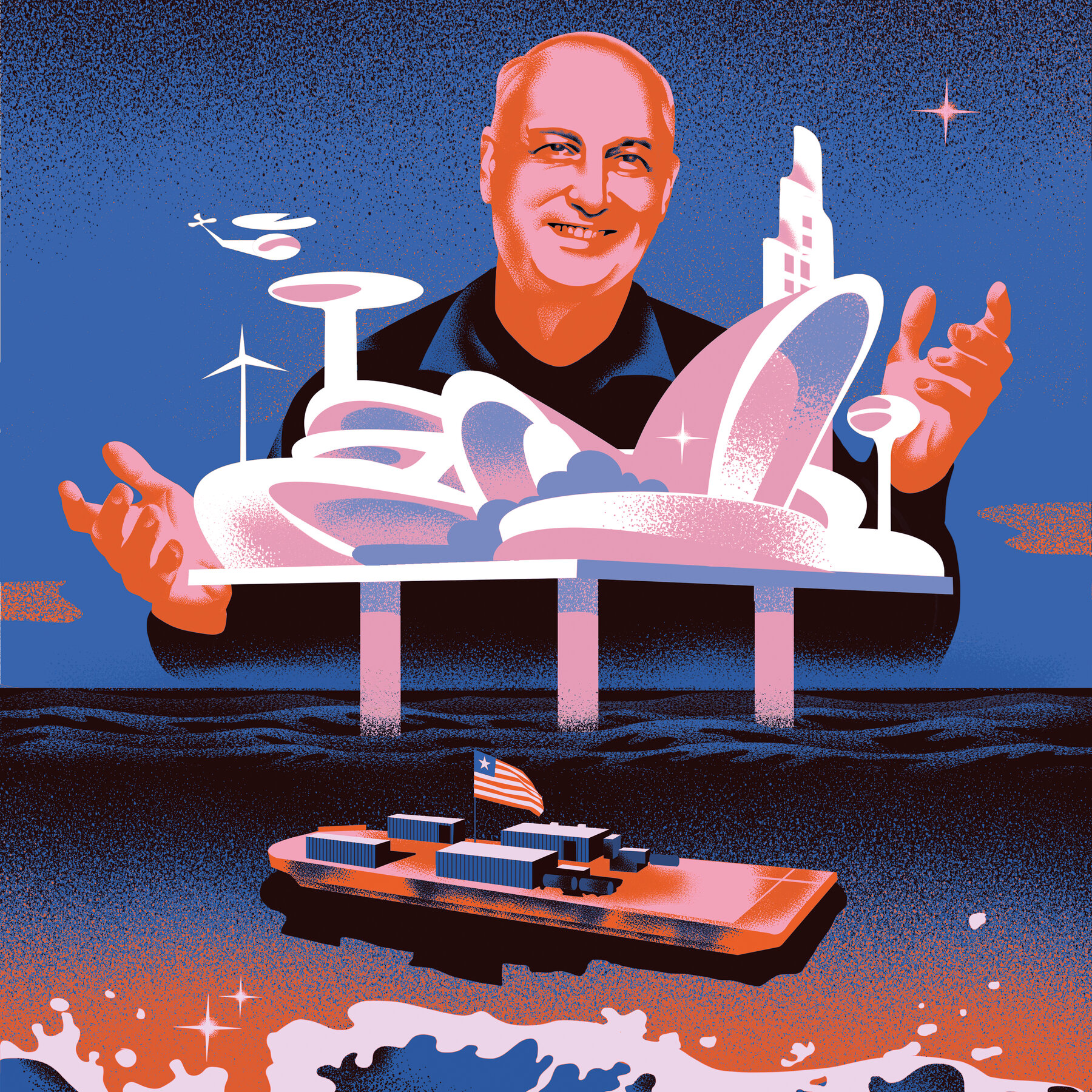 Landi’s barge, the Aisland 1, was a rundown vessel with the dimensions of a large commercial aircraft. It had a deck with six blue shipping containers that served as living quarters, complete with solar-powered air-conditioners and a desalination system. The rest of the barge was cluttered with various equipment, including ropes, crates, fans, oil and water tanks, a freezer filled with meat, and a bag of reinforced concrete mix for repairs. A Liberian flag flew in the wind.